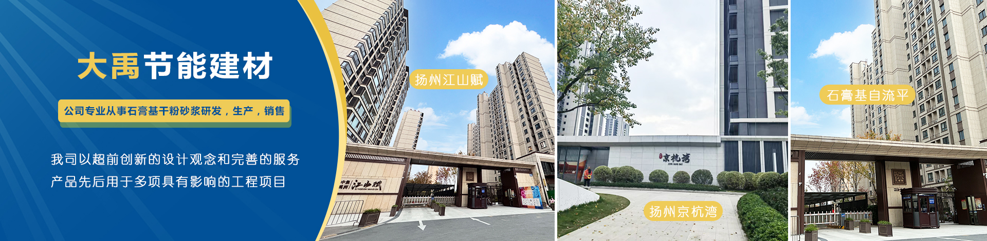 揚(yáng)州市大禹節(jié)能建材科技有限公司成立于2005年9月,位于聯(lián)合國宜居城市---江蘇省揚(yáng)州市,地處江都經(jīng)濟(jì)開發(fā)區(qū),與揚(yáng)、鎮(zhèn)、泰三市接壤,交通十分便捷。公司是專業(yè)從事石膏基干粉砂漿研發(fā),生產(chǎn),銷售一體化的綜合性科技型企業(yè),為國家標(biāo)準(zhǔn)GB/T2862-2012《抹灰石膏》的參編單位?! 」緭碛袊鴥?nèi)一流的特種砂漿生產(chǎn)線,并配有各種先進(jìn)的檢測(cè)儀器,年生產(chǎn)能力可達(dá)10萬噸。各崗位管理及技術(shù)人員齊備,對(duì)產(chǎn)品···